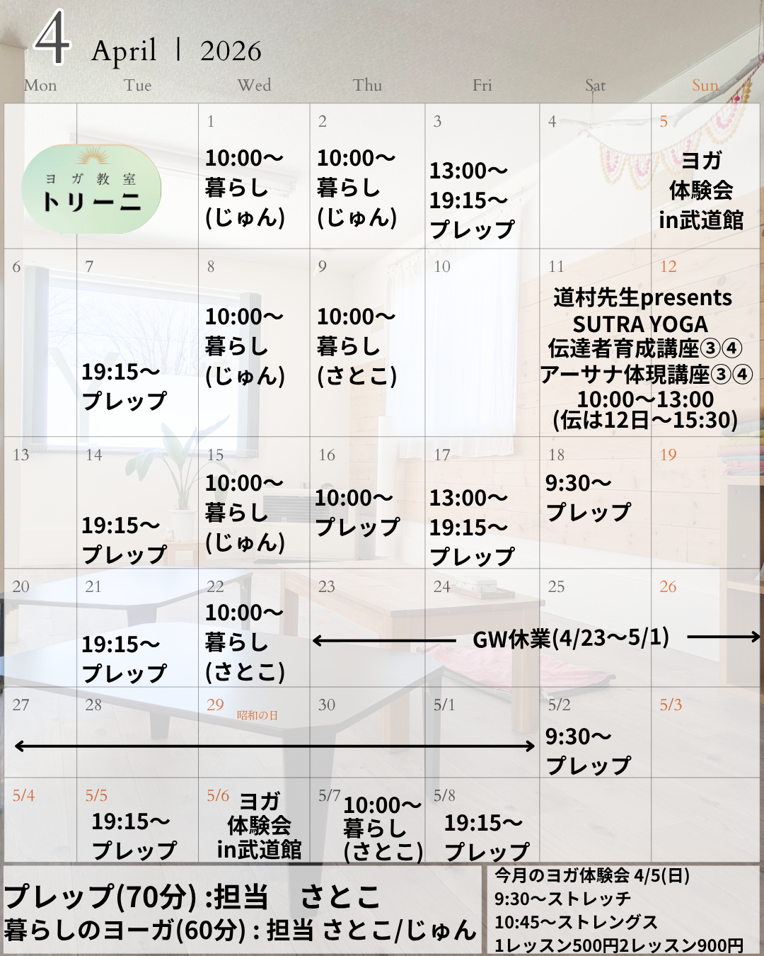 ・4/9(木)、4/22(水)はさとこが代行レッスンを行います。