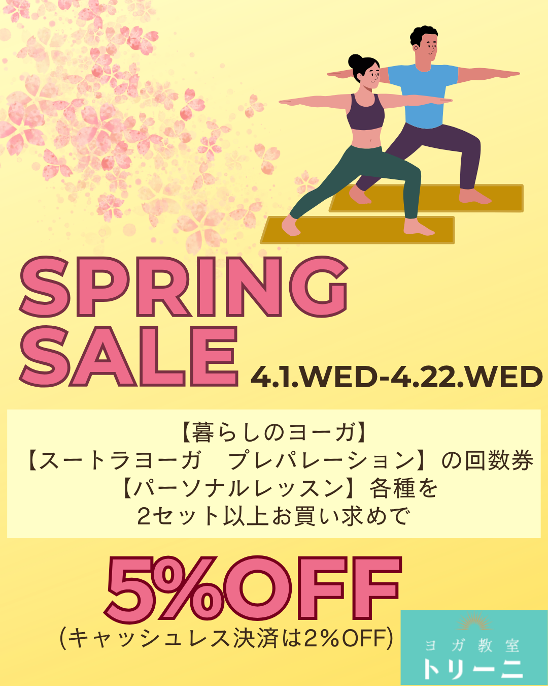 新着情報 News・Blog 2026年4月7日 スプリングセール開催中!! 4/1〜4/22(水)スプリングセール開催中🌸 【2点以上お買い求めで5%OFF🎉】 (キャッシュレス決済は2%OFF) 例) ・暮らし+暮らし ・暮らし+プレップ ・プレップ+プレップ ・暮らし+パーソナル30分 ・プレップ+パーソナル30分 ・パーソナル30分×2セット などなど 組み合わせは自由😆😆 ⭕️有効期限は使い始めてからカウントが始まるので安心👍 ⭕️オンラインレッスンの方もチケットご購入頂けます🙆 質問等はお気軽にLINEにてお問い合わせ下さい! < 前の記事へ お知らせ一覧へ > 次の記事へ >
